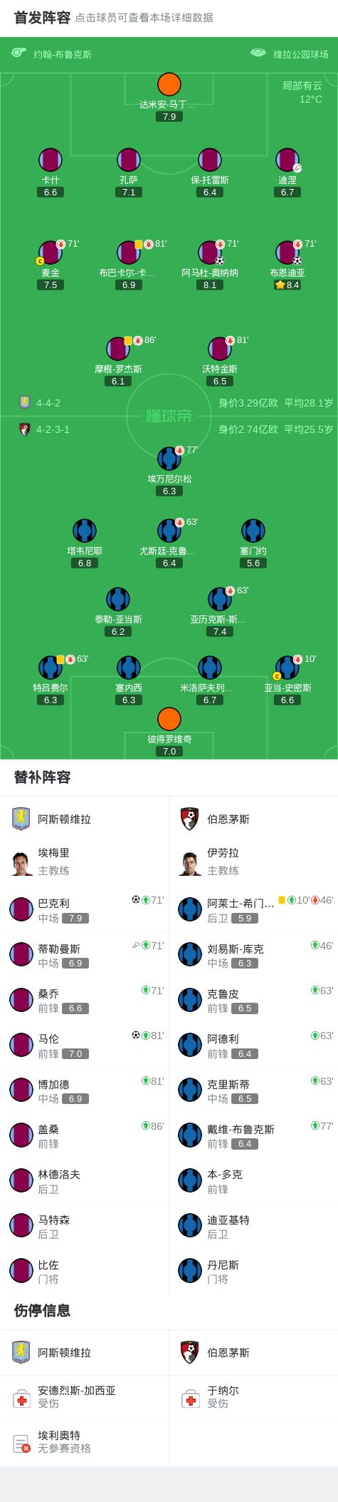 維拉4-0伯恩茅斯,大馬丁撲點,布恩迪亞、奧納納、馬倫破門