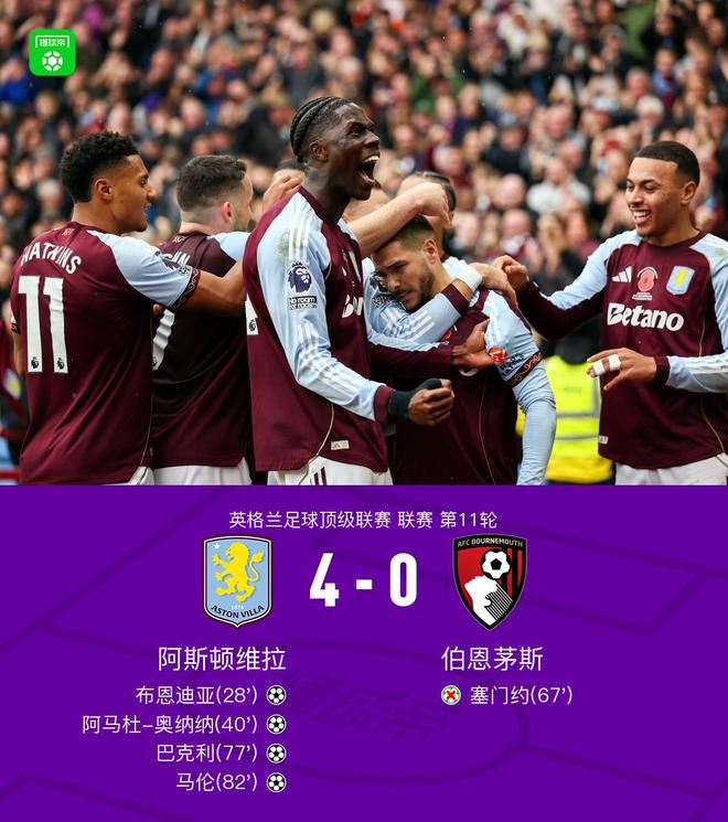 北京時間11月9日22:00,英超第11輪,阿斯頓維拉坐鎮(zhèn)主場迎戰(zhàn)伯恩茅斯。比賽中,布恩迪亞任意球破門,隨后阿馬杜-奧納納遠(yuǎn)射再下一城;下半場,塞門約主罰點球被大馬丁撲出,巴克利、馬倫先后取得進球。最終,阿斯頓維拉以4-0戰(zhàn)勝伯恩茅斯。